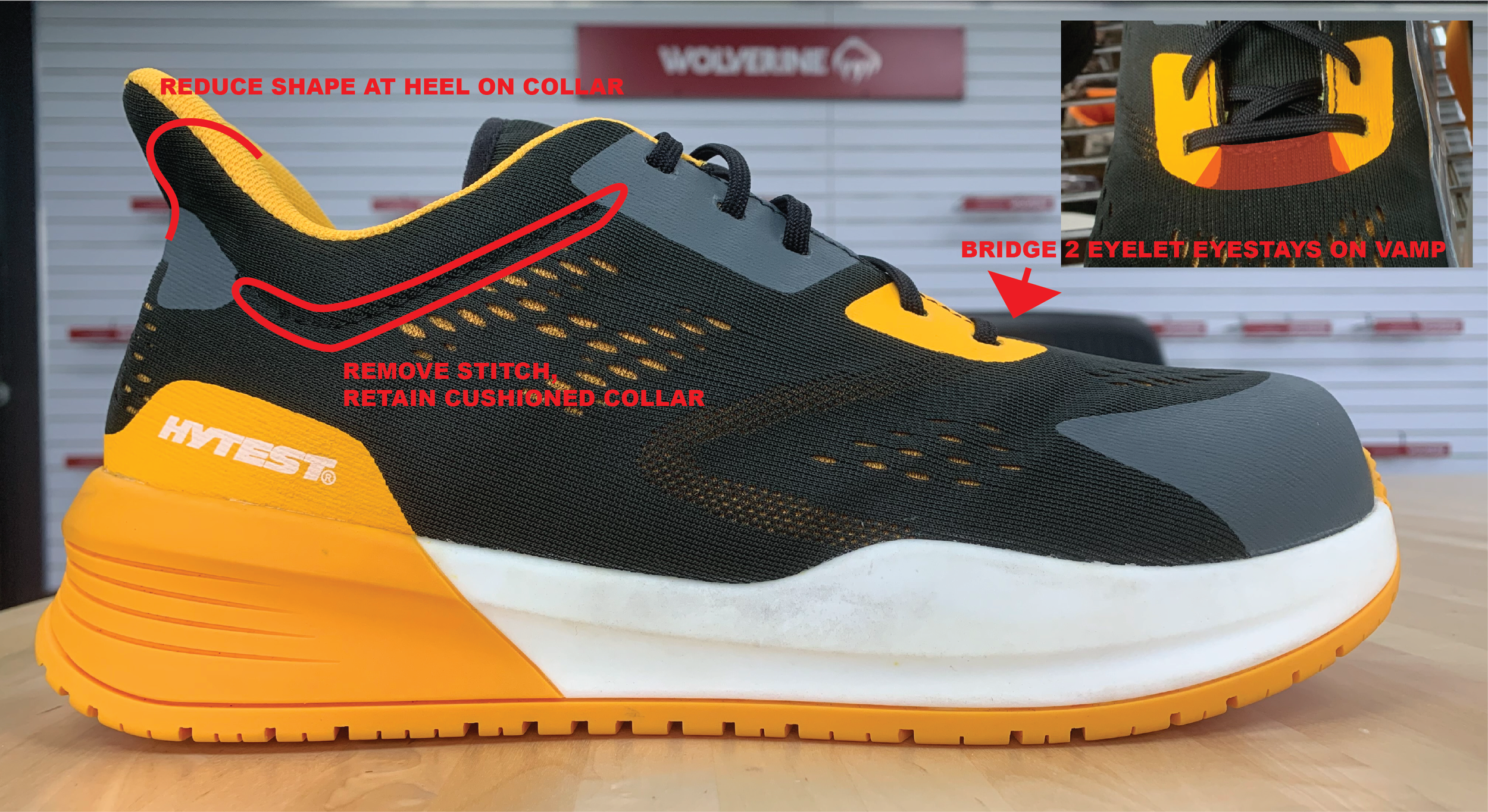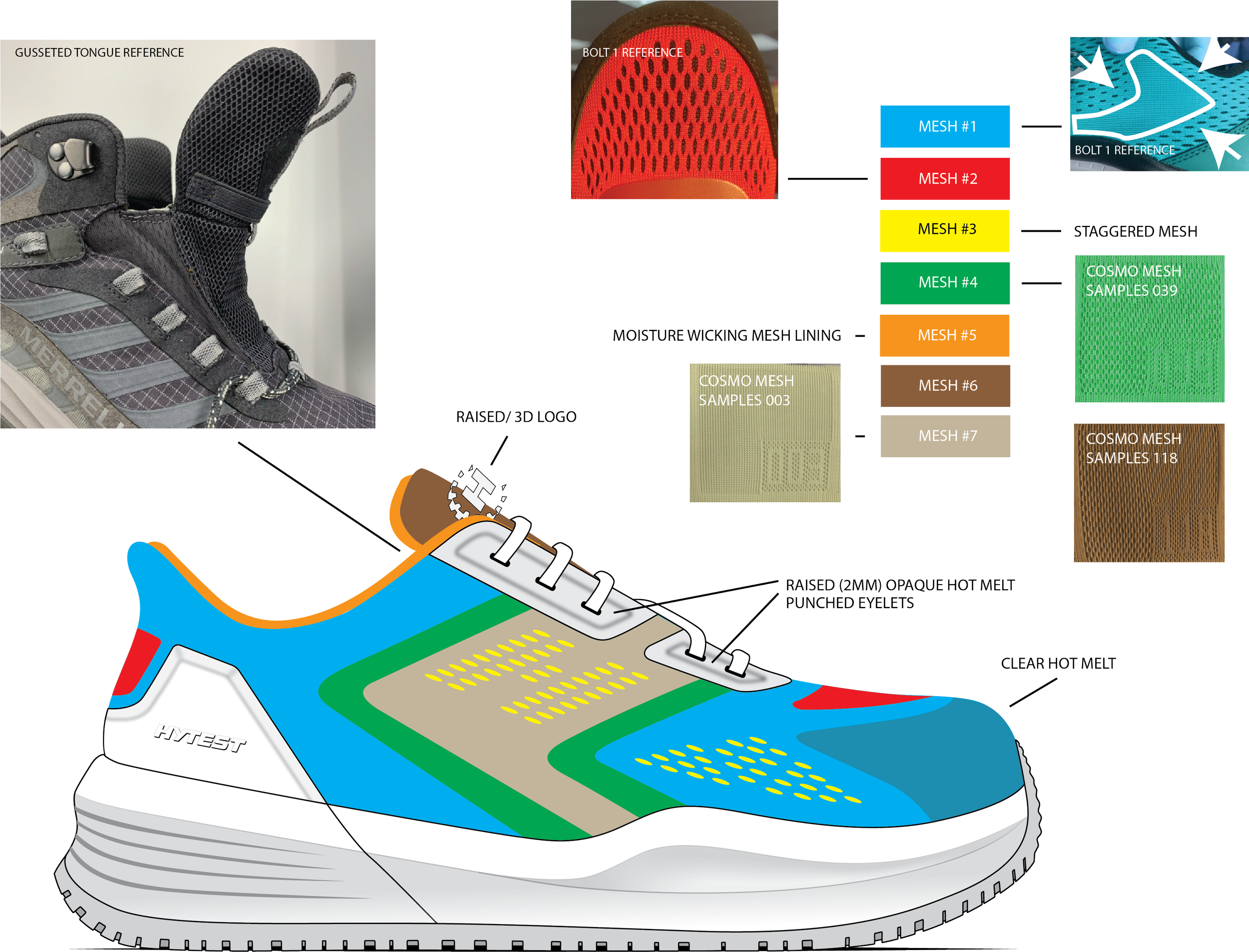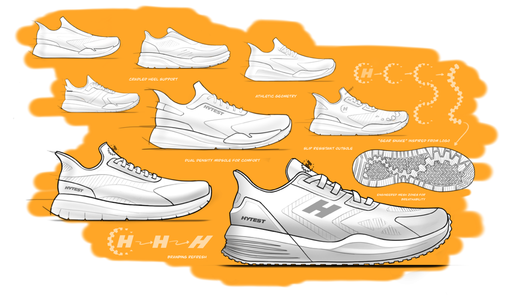 BOLT 2 WORK SNEAKER Brief:Create an athletic inspired safety toe shoe for warehouse workers age 18-25 Line art callouts from tech pack Tooling Textures Red line corrections on tooling blueprint tooling cross sections prototype red line updates for initial sample improvment refined design with feature callouts