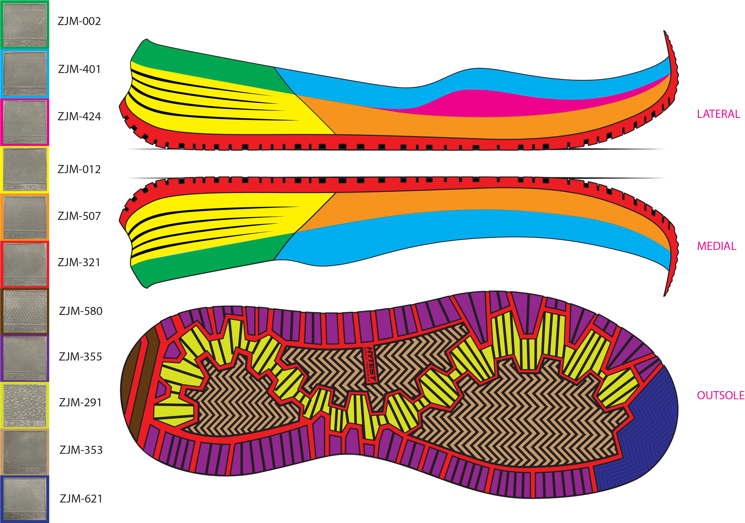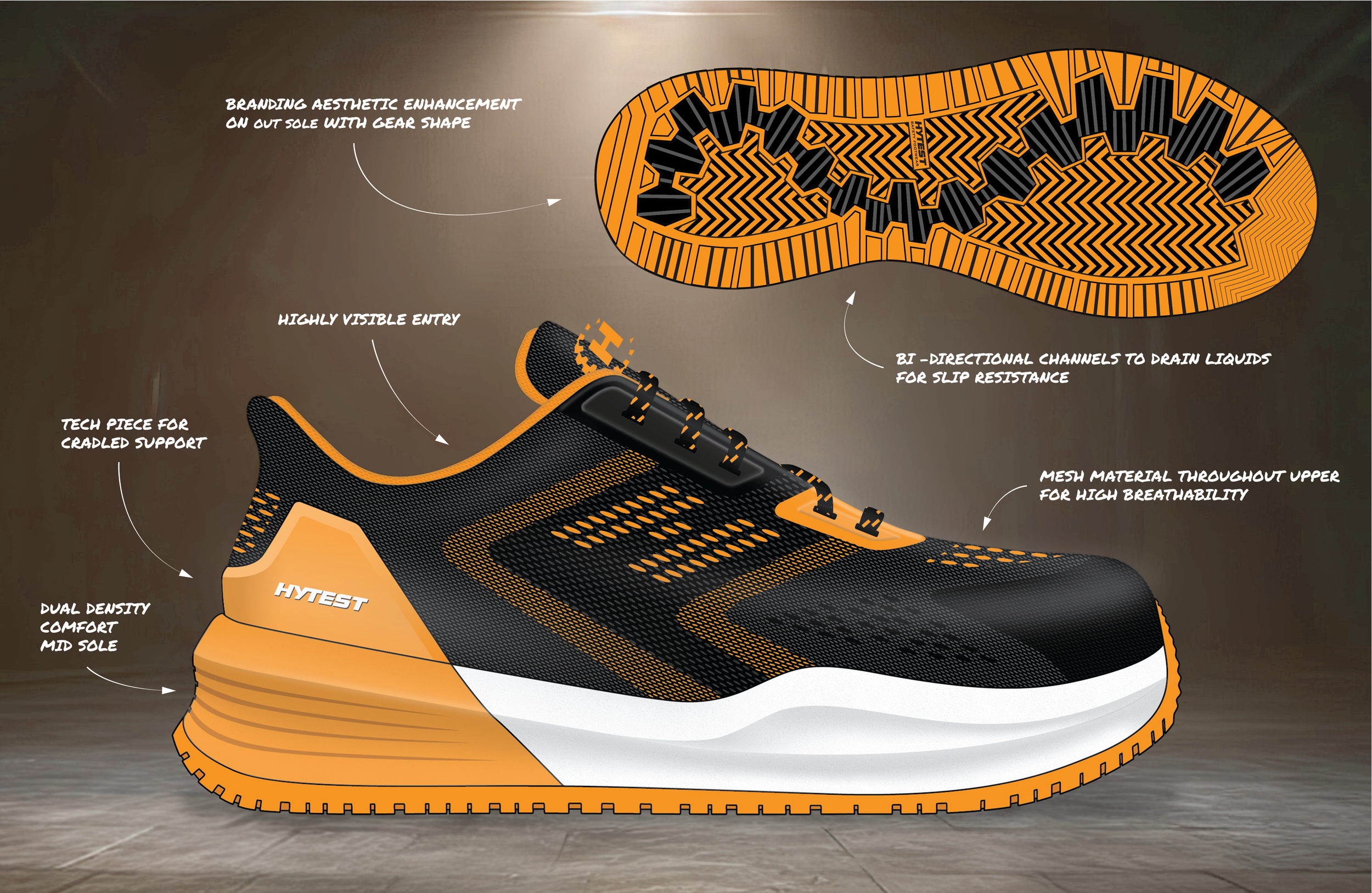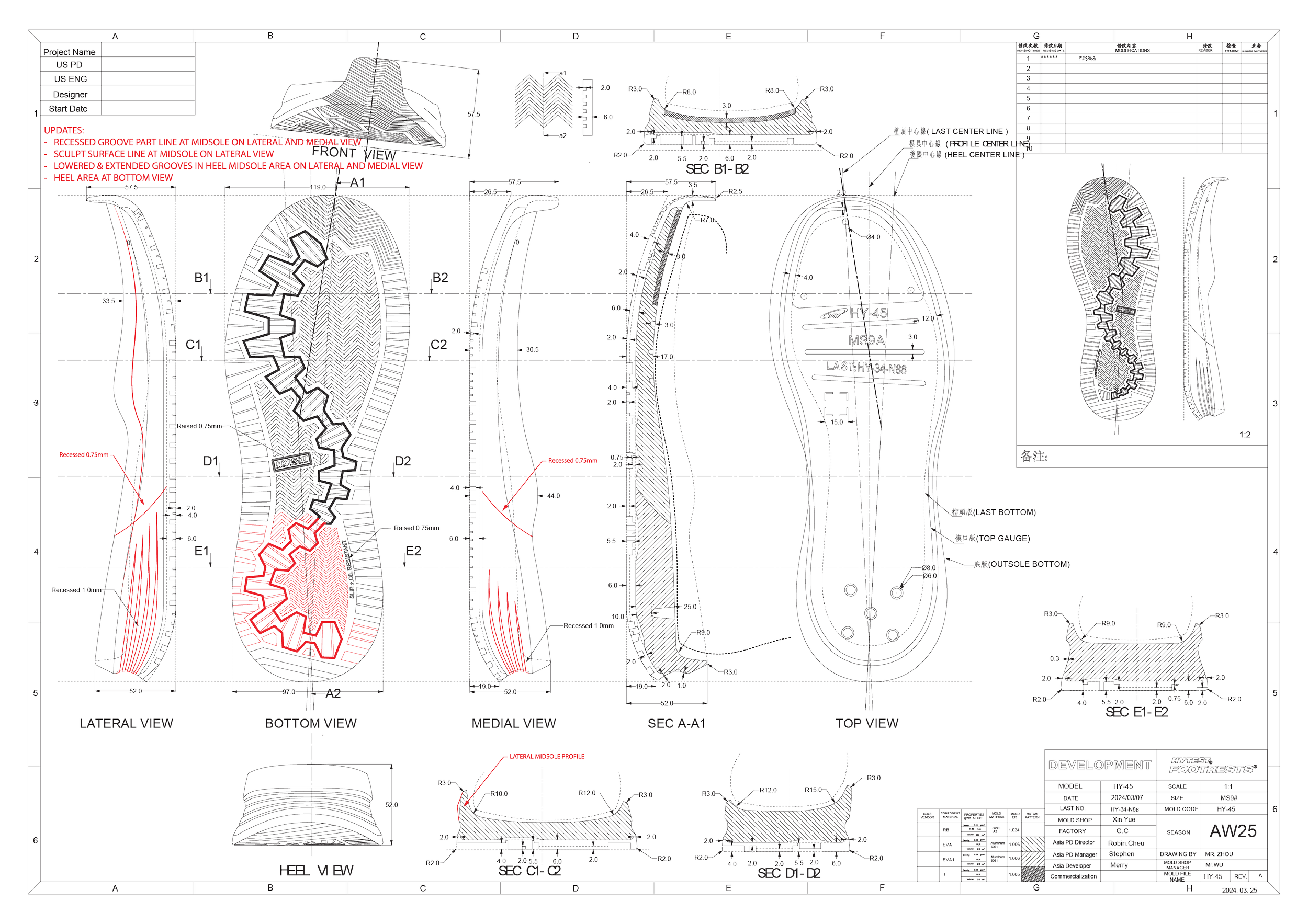 BOLT 2 WORK SNEAKER Brief:Create an athletic inspired safety toe shoe for warehouse workers age 18-25 Line art callouts from tech pack Tooling Textures Red line corrections on tooling blueprint tooling cross sections prototype red line updates for initial sample improvment refined design with feature callouts