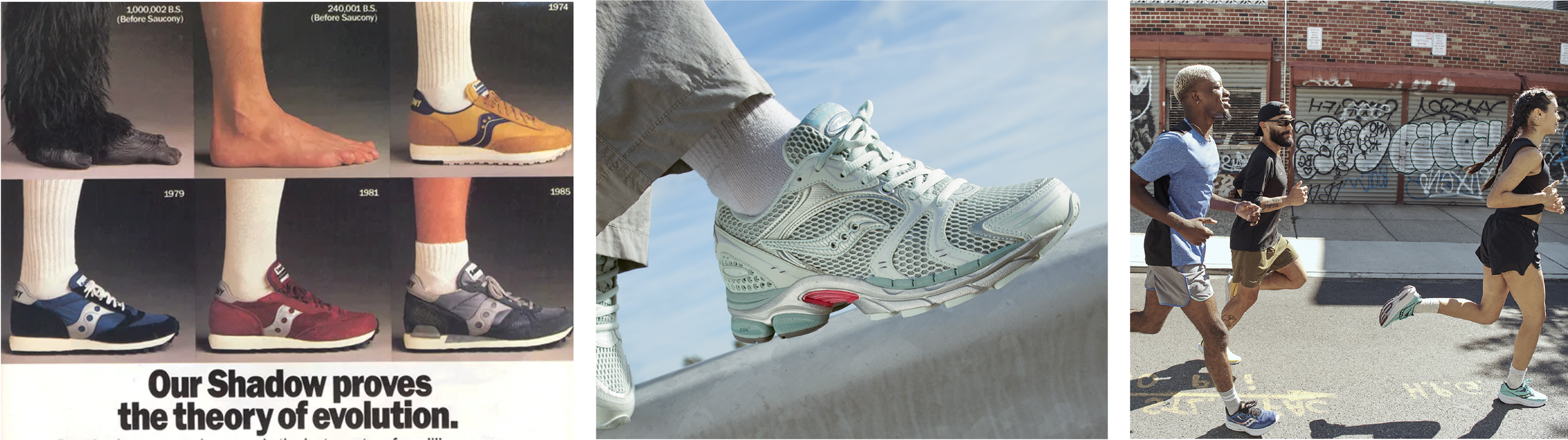 Saucony’s brand values are “Good Performance, Good Health, and Good Community.” Classic icons include the Shadow and Triumph 4.